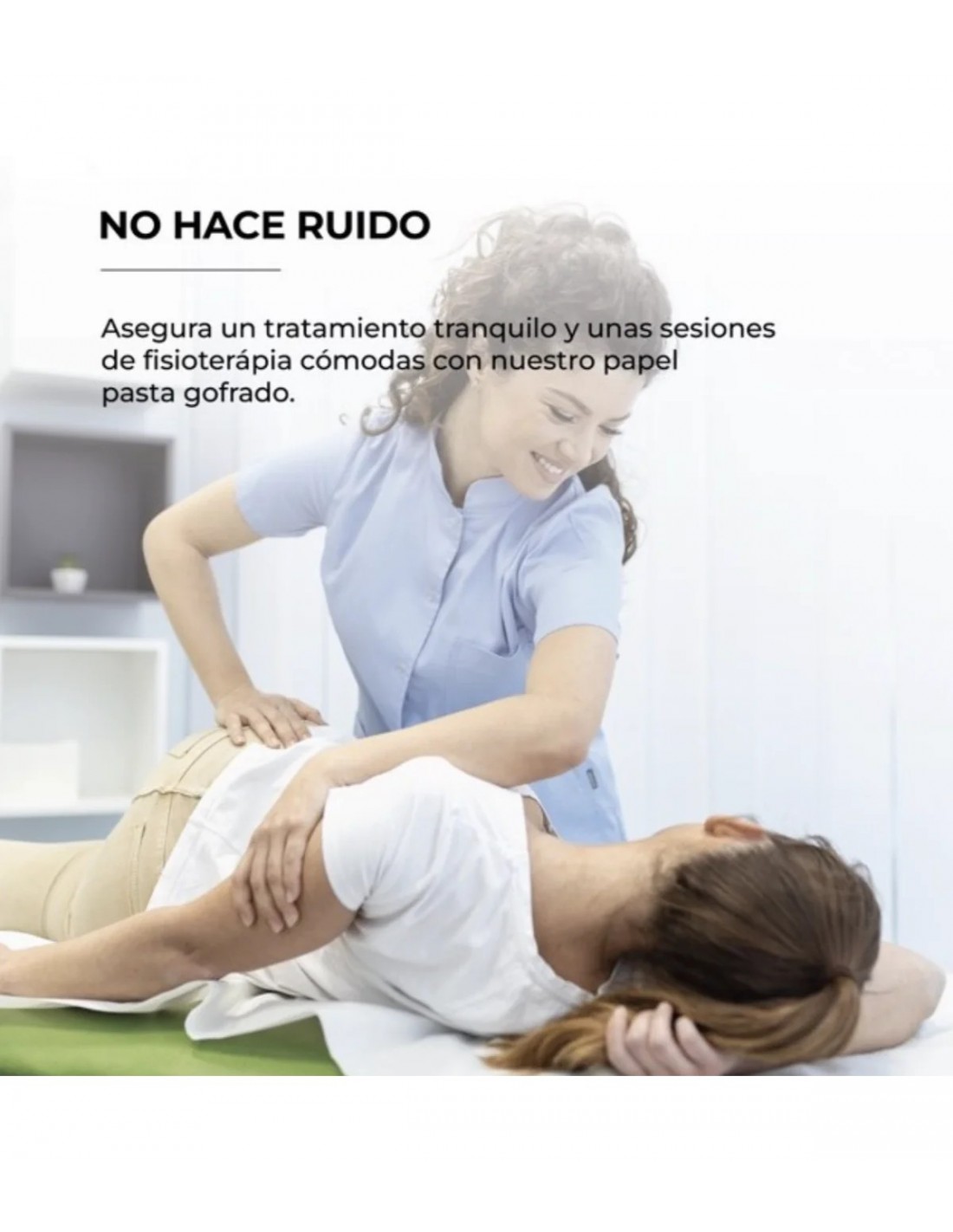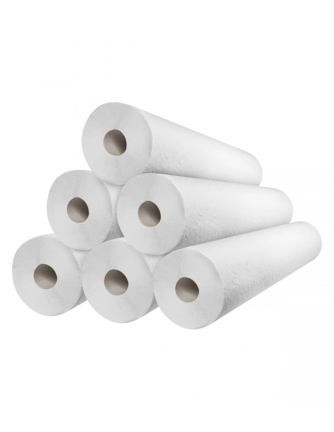 Papel Camilla 2 capas en pasta 100% celulosa virgen, gofrado y con precorte cada 80 cm. Pack de 6 rollos fabricados en España, resistentes y desechables, ideales para centros de estética, fisioterapia y salud.