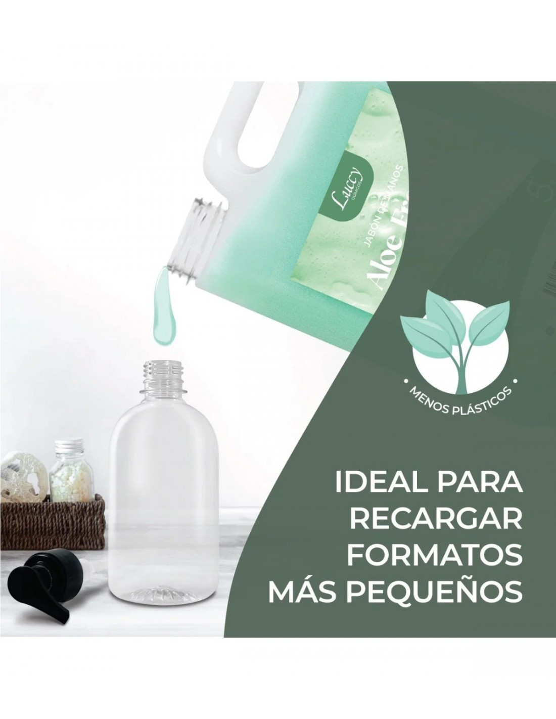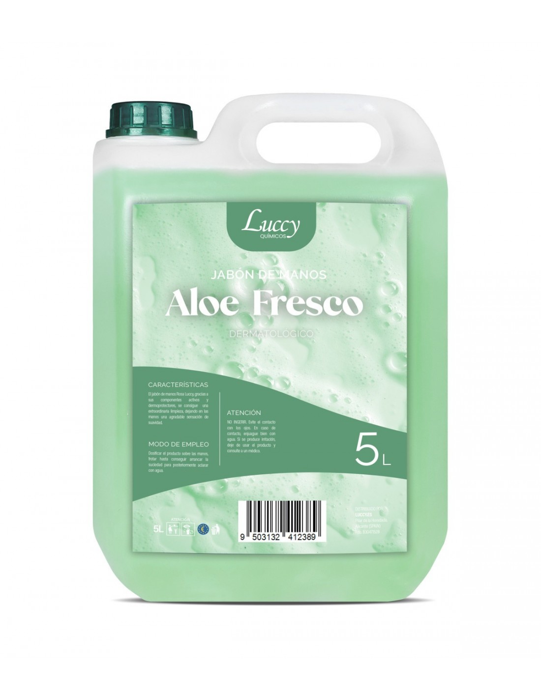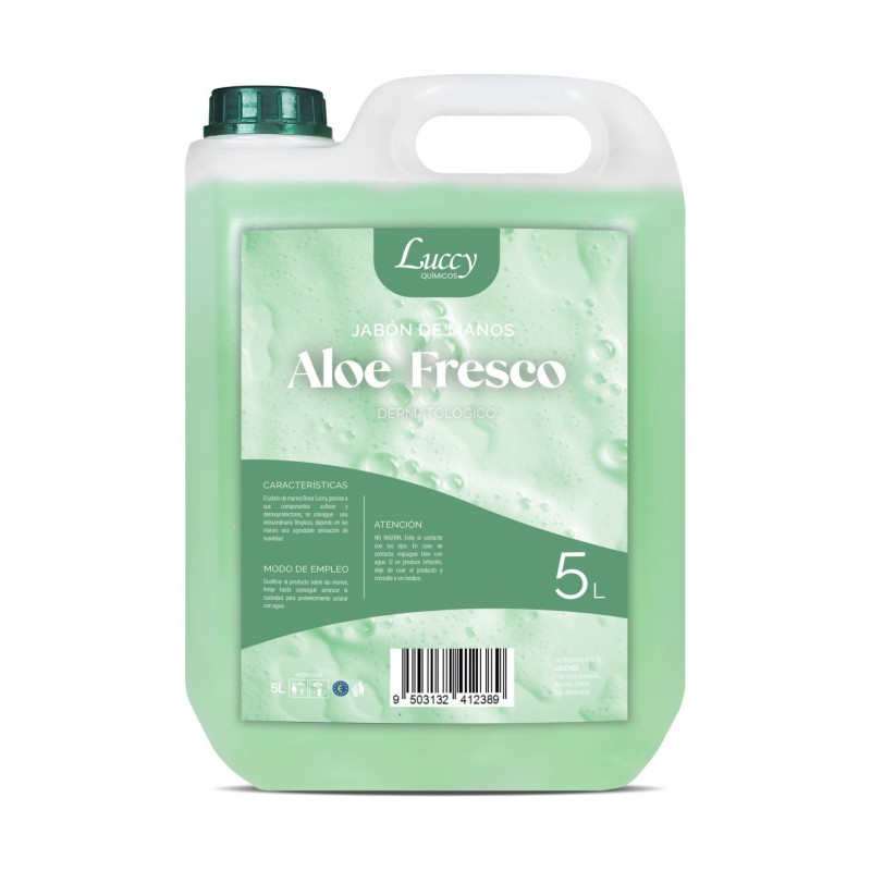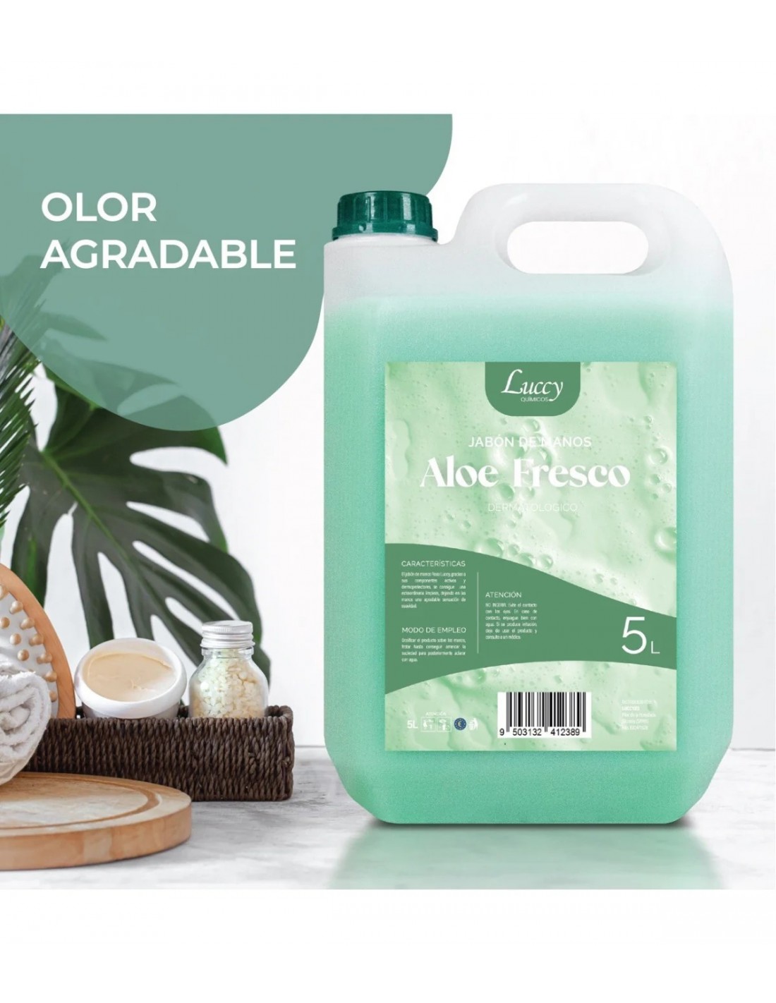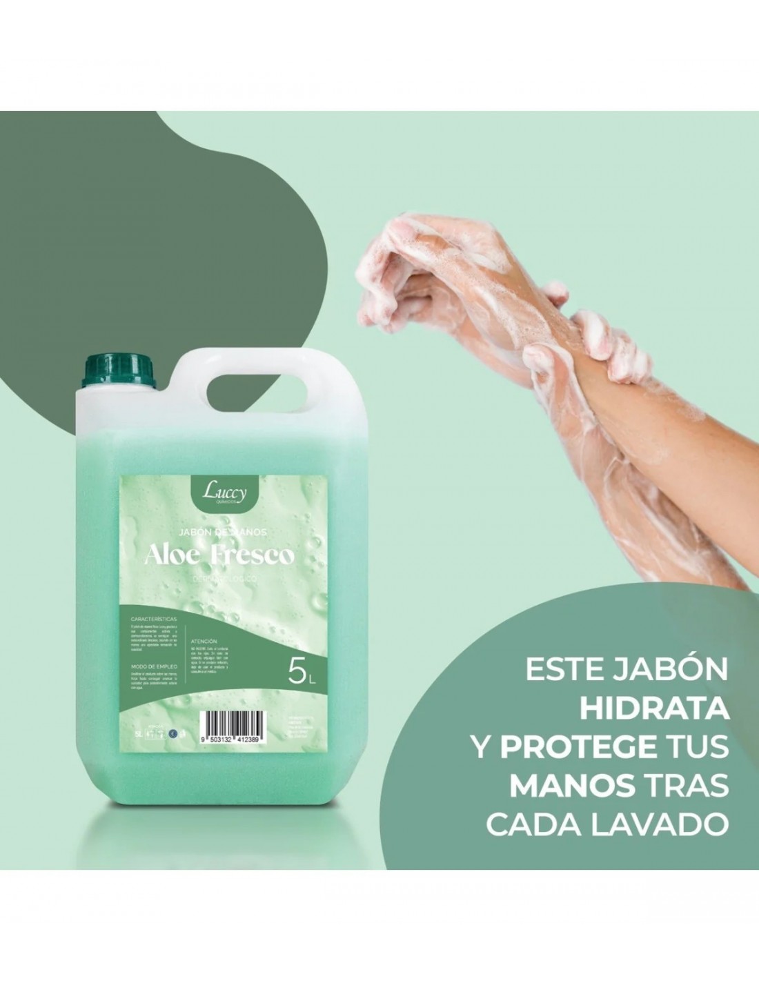 Jabón de manos Aloe Vera en formato 5 litros. Con pH neutro, limpia y elimina gérmenes a la vez que hidrata y protege la piel. Ideal para uso diario en hogares, oficinas y centros profesionales.
