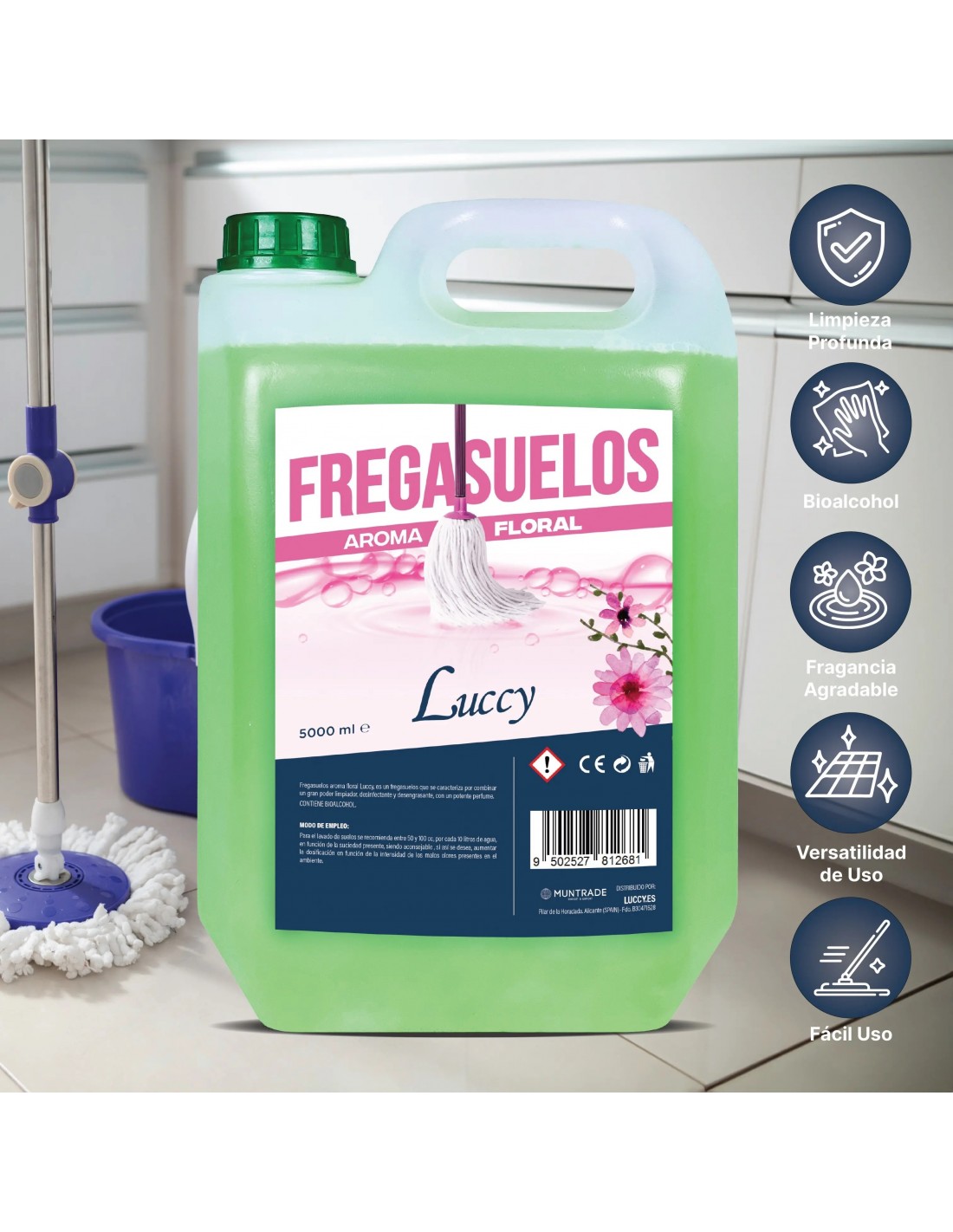 Fregasuelos aroma floral 5L con poder limpiador, desinfectante y desengrasante. Su fragancia floral duradera deja un ambiente fresco e higienizado en cualquier espacio.