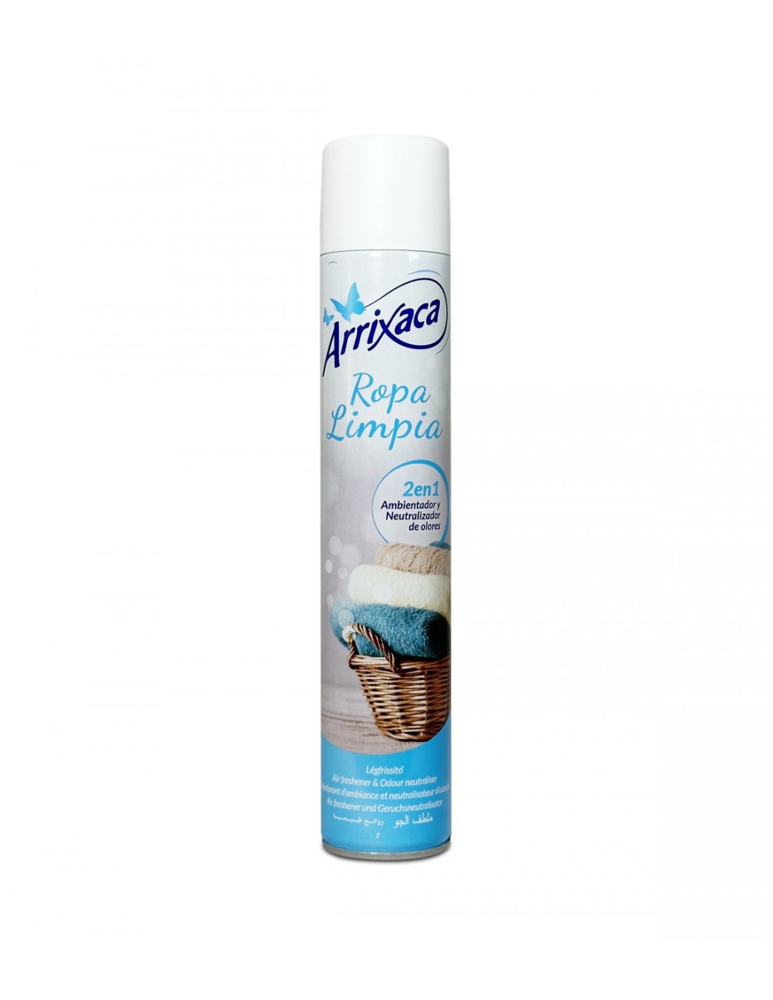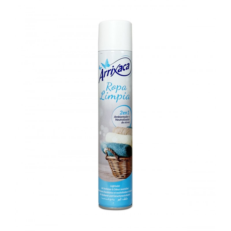 Ambientador olor ropa limpia Arrixaca 400 ml en spray. Neutraliza malos olores y aporta frescura profesional con notas florales y almizcladas. Ideal para negocios y hogares.