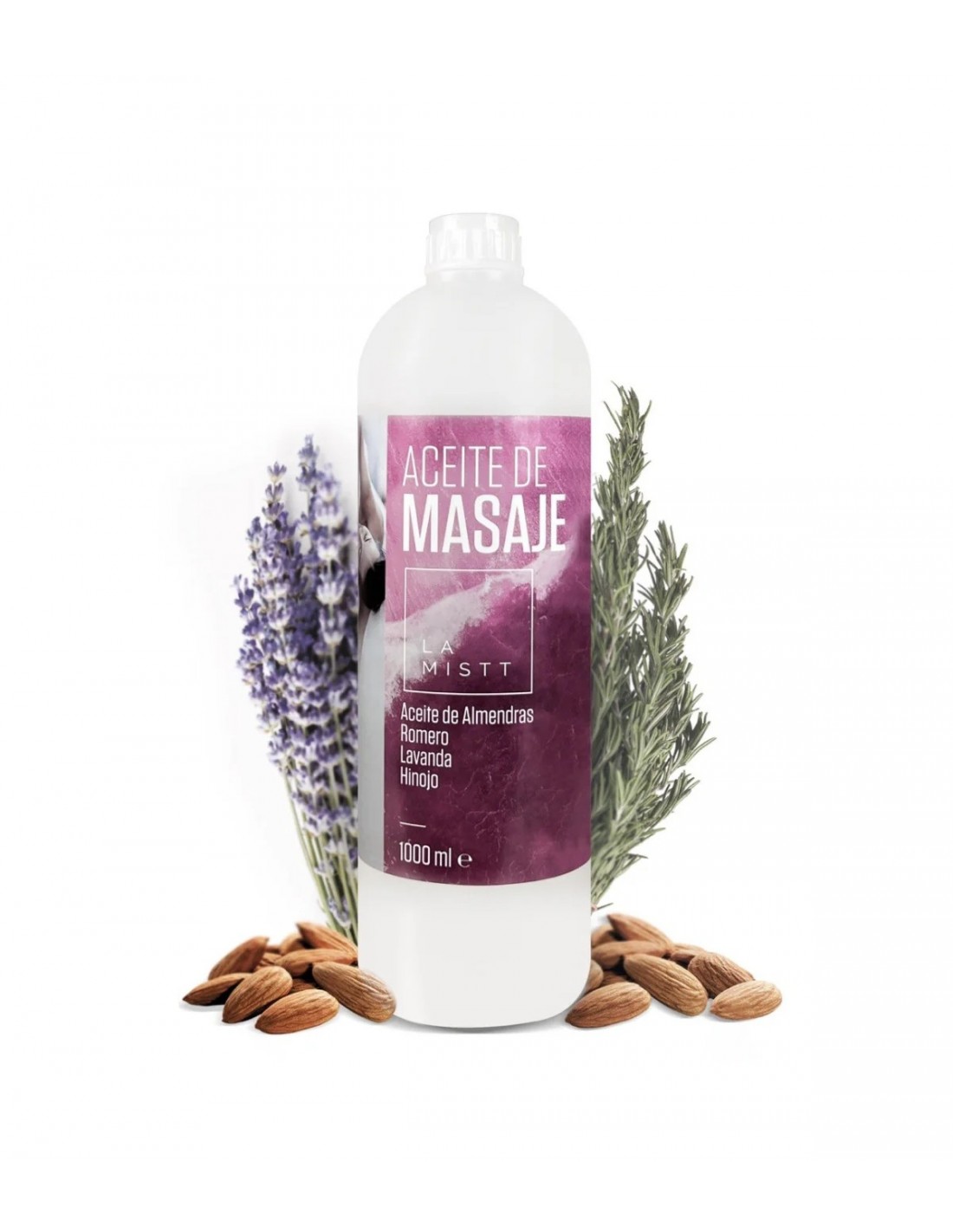 El Aceite de Masaje 1L con almendras, romero, lavanda e hinojo hidrata, suaviza y regenera la piel, ofreciendo una experiencia relajante y terapéutica.