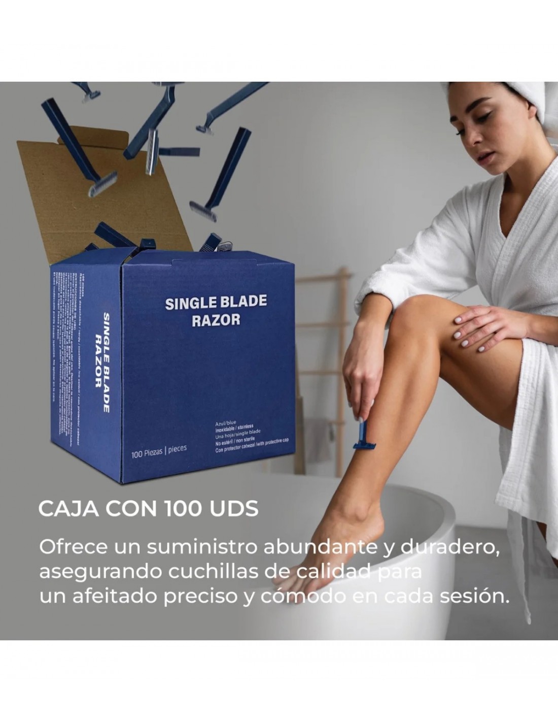 Pack de 100 cuchillas rasuradoras desechables de 1 hoja en acero inoxidable, ideales para un afeitado cómodo, preciso e higiénico en estética y uso médico.