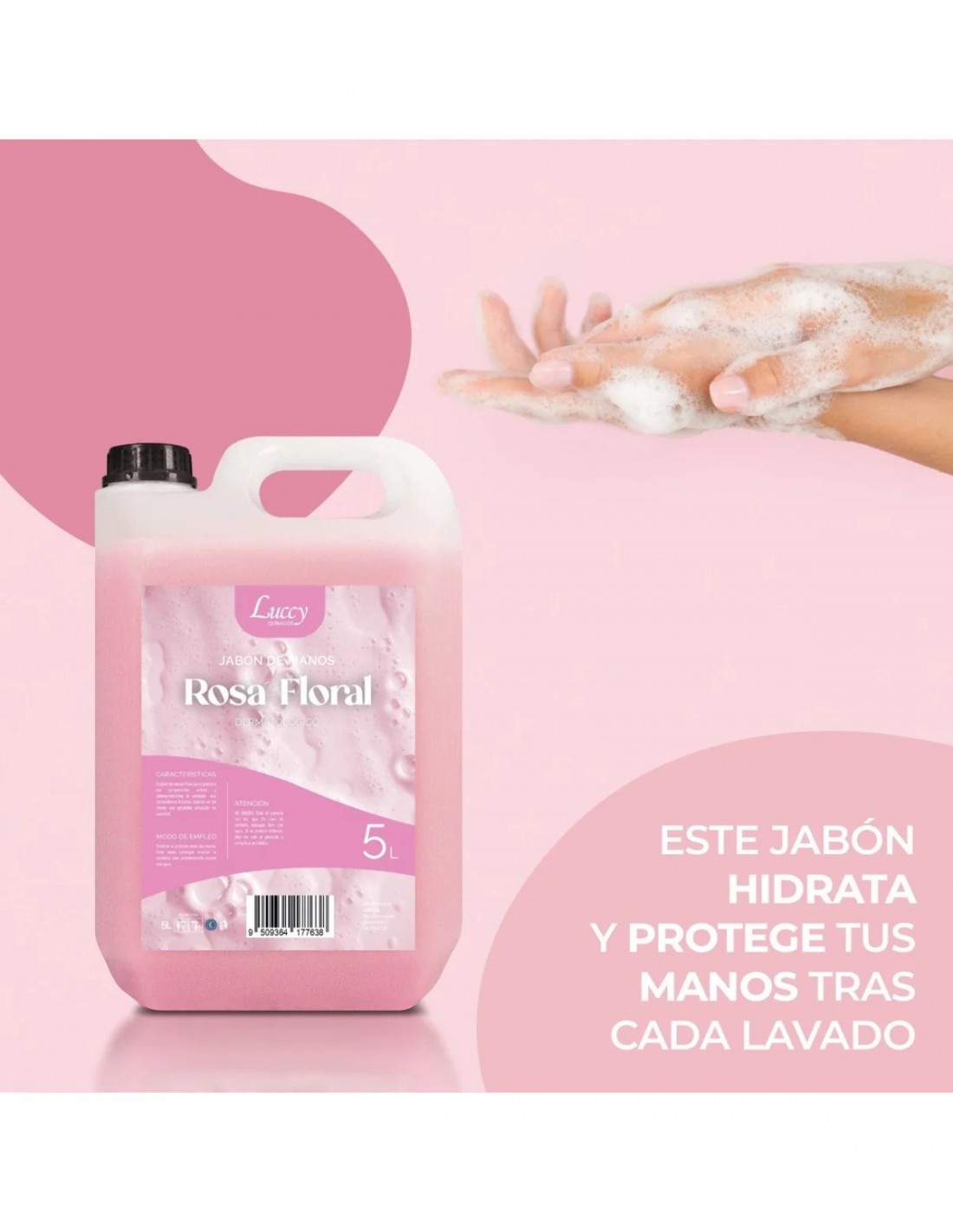 Jabón de manos Floral Rosa en formato profesional de 5 litros. Limpieza eficaz, cuidado suave y agradable fragancia para uso diario en baños y zonas de trabajo.